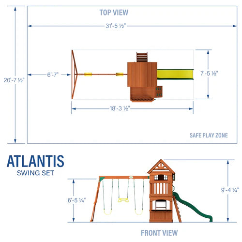 Create an exciting outdoor play space with the Backyard Discovery Atlantis Swing Set, perfect for families who want big adventures in smaller spaces. The Atlantis is designed with an upper clubhouse complete with a wood roof, bay windows, and a balcony to encourage imaginative play and exciting adventures. Below, a versatile space transforms from a cozy hideout to a sand pit, featuring a snack shelf, so kids can refuel during play time. Little explorers can choose their path to the elevated clubhouse with either the wide step ladder providing easy accessibility or the daring rock wall for a more challenging climb. The thrilling 8-foot speedy wave slide provides swift, safe rides back to the ground, complemented by two belt swings and a trapeze bar for shared playground fun. This thoughtfully designed wooden swing set proves that compact spaces can still offer endless play possibilities. Crafted from naturally durable cedar wood, it comes ready to assemble with guided instructions through the interactive BILT® app for easier installation. The Atlantis Wood Swing Set brings everything families love about larger playsets in a size that fits perfectly in smaller backyards, creating a beloved play space that will last for years of outdoor adventures.
