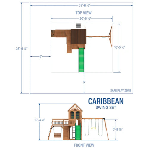 Create the ultimate home playground with Backyard Discovery’s Caribbean Swing Set, where beach house charm meets active outdoor play. The spacious upper clubhouse features a cabana-style retreat with its large window, flowing curtains, and inviting balcony. The staircase leads to the connecting deck and balcony, providing plenty of room for imaginative play. Adventurous climbers can tackle the rock wall for an exciting route to the upper deck, while the shaded hammock and cozy bench swing below provide the perfect spot to take a break from all the action. The large speedy wave slide offers thrilling rides, while two classic belt swings and a trapeze bar invite endless outdoor fun. This wooden swing set thoughtfully combines climbing, swinging, and sliding elements to create a complete outdoor playground right at home. Keep track of memories with the built-in growth board that marks childhood milestones. Every detail is designed to spark imagination and encourage active play while maintaining a stylish coastal aesthetic. With a ready-to-assemble design and guided instructions through the interactive BILT® app, you can build your kids swing set kit in no time. The Caribbean Swing Set transforms your backyard into an island-inspired play retreat where memories are made every moment.