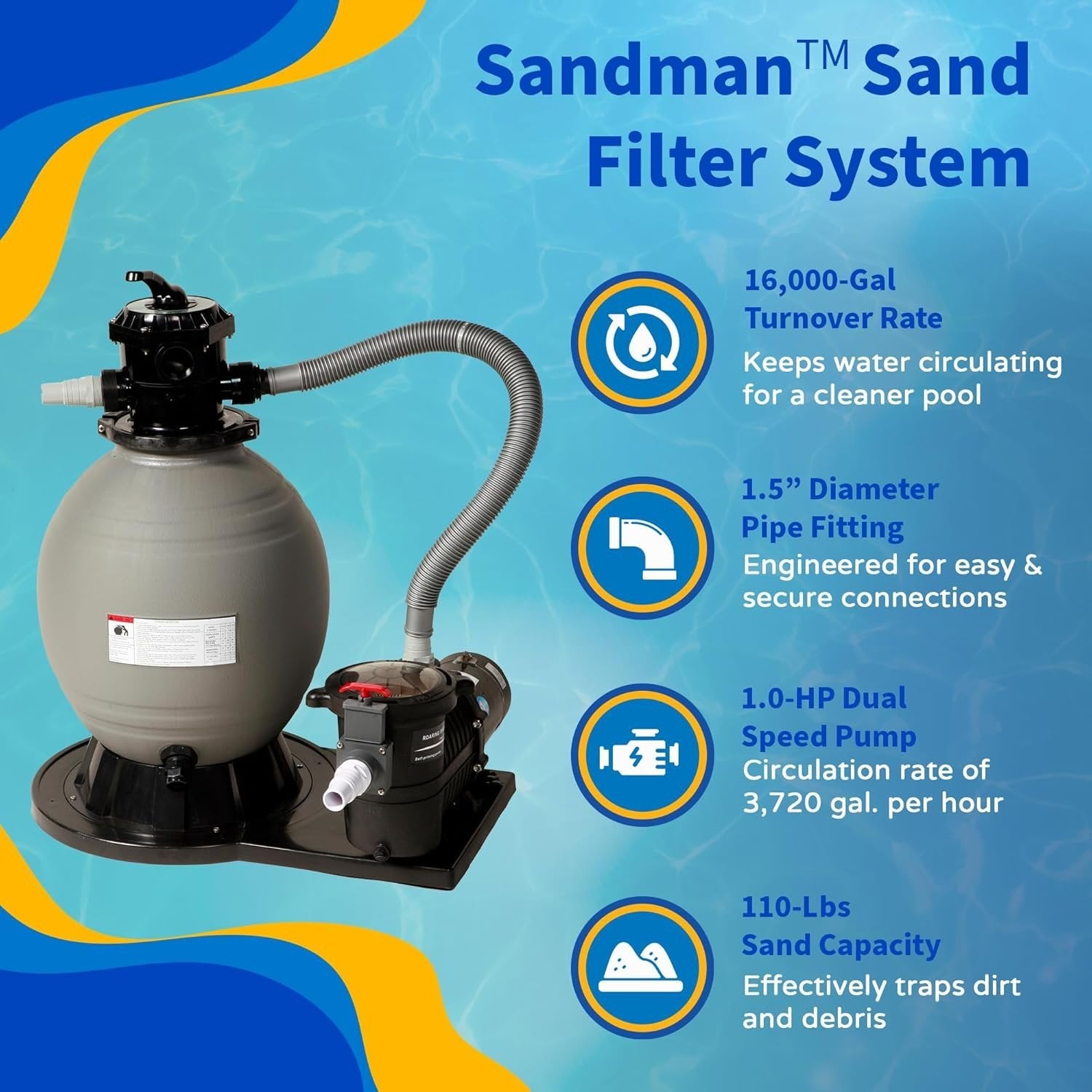 Includes liner, pump and sand filter system, A-frame entry ladder, and wide-mouth skimmer