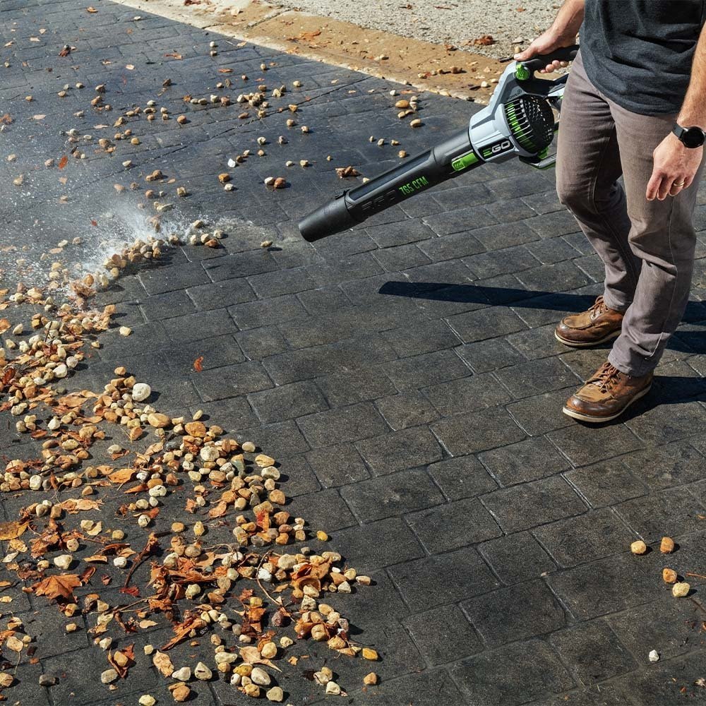 The EGO POWER+ 765 CFM Blower delivers powerful clearing performance with air speeds up to 200 MPH and up to 765 CFM. Its speed control dial allows you to adjust your airflow from 260 CFM to 580 CFM for ultimate control. Activate turbo mode when you need to power through heavy debris including wet leaves, rocks, mud, and snow at 765 CFM and up to 200 MPH with the tapered nozzle attached. The variable speed trigger introduces a redesigned cruise control dial for consistent blowing. This leaf blower features a high-efficiency brushless motor that delivers long runtimes, low vibrations, and an extended motor life. Turbine fan engineering, inspired by advanced aeronautics technology, performs better than premium gas leaf blowers. The included tapered and spread nozzles make clearing debris in all conditions easy, and IPX4 weather-resistant construction delivers protection from the elements. This cordless leaf blower delivers up to 90 minutes of average runtime on a single charge with the recommended 56V 5.0Ah ARC Lithiumâ„¢ battery (available separately). This quiet, lightweight, and compact electric leaf blower gets the job done faster and quieter than gas. Experience Power Beyond Beliefâ„¢ without the noise, fuss, or fumes.