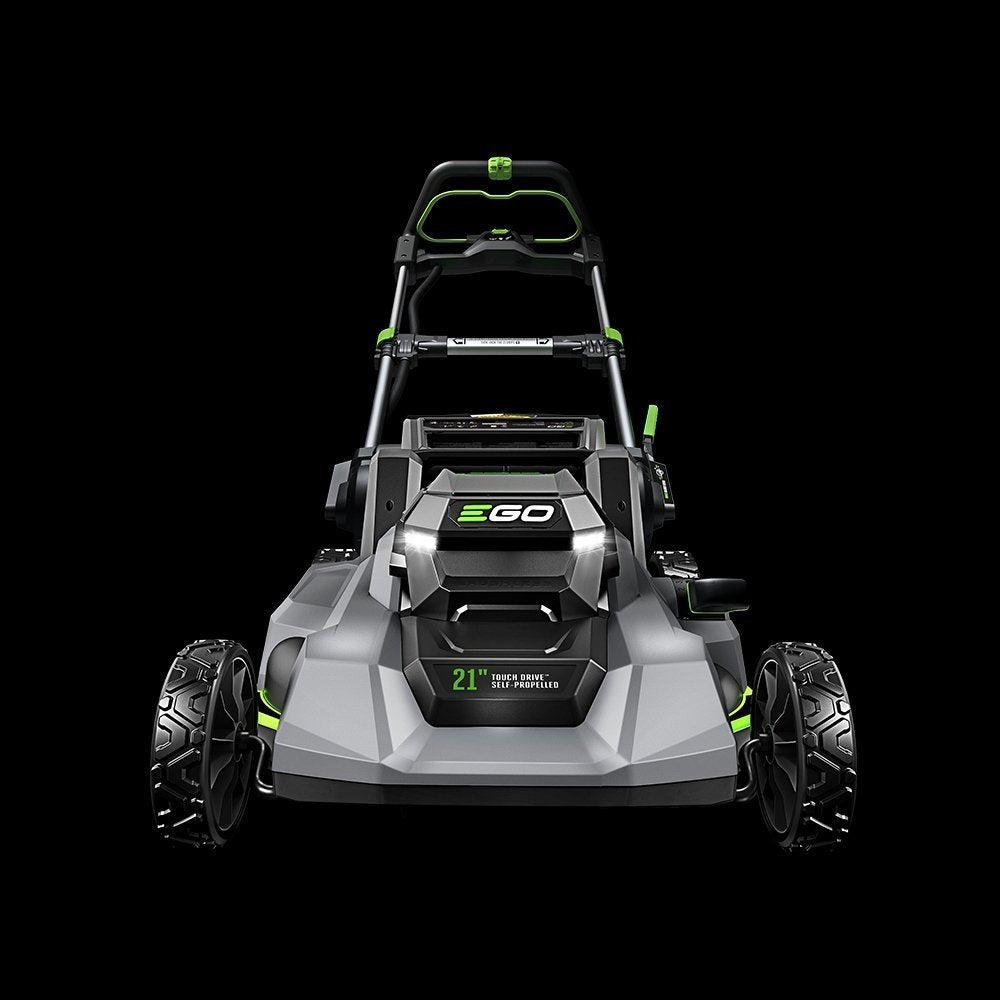 The EGO POWER+ 21” Self-Propelled Mower with Touch Drive™ delivers up to 6.0 foot-pounds of cutting torque—power that exceeds gas without the noise, fuss, or fumes. Touch Drive™ technology puts complete control of the self-propelled system in the palm of your hands by using pressure to engage the system. Easily control the variable speed with a dial positioned at your fingertips for safe and convenient operation. This cordless lawn mower delivers up to 60 minutes of run time on a single charge with the included 56V ARC Lithium™ battery. The electric lawn mower delivers precision cutting with its advanced mulching blade and seven cutting height positions from 1.25 to 4 inches, adjustable with one hand. Three-in-one functionality delivers your choice of mulching, side discharge, or bagging your grass clippings; an easy-access two-bushel grass collection bag is included. This self-propelled lawn mower includes bright LED lights for added visibility when mowing at dawn or dusk, and it folds flat for compact storage between cuts. Experience Power Beyond Belief™ with the EGO POWER+ 21” Self-Propelled Lawn Mower with Touch Drive™.