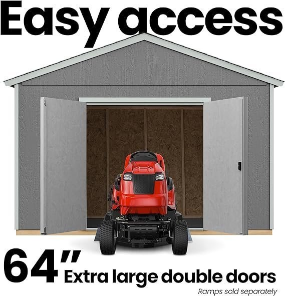 Extra-large 5″-4″ wide doors feature continuous galvanized steel hinges. Roll in lawnmowers with ease.