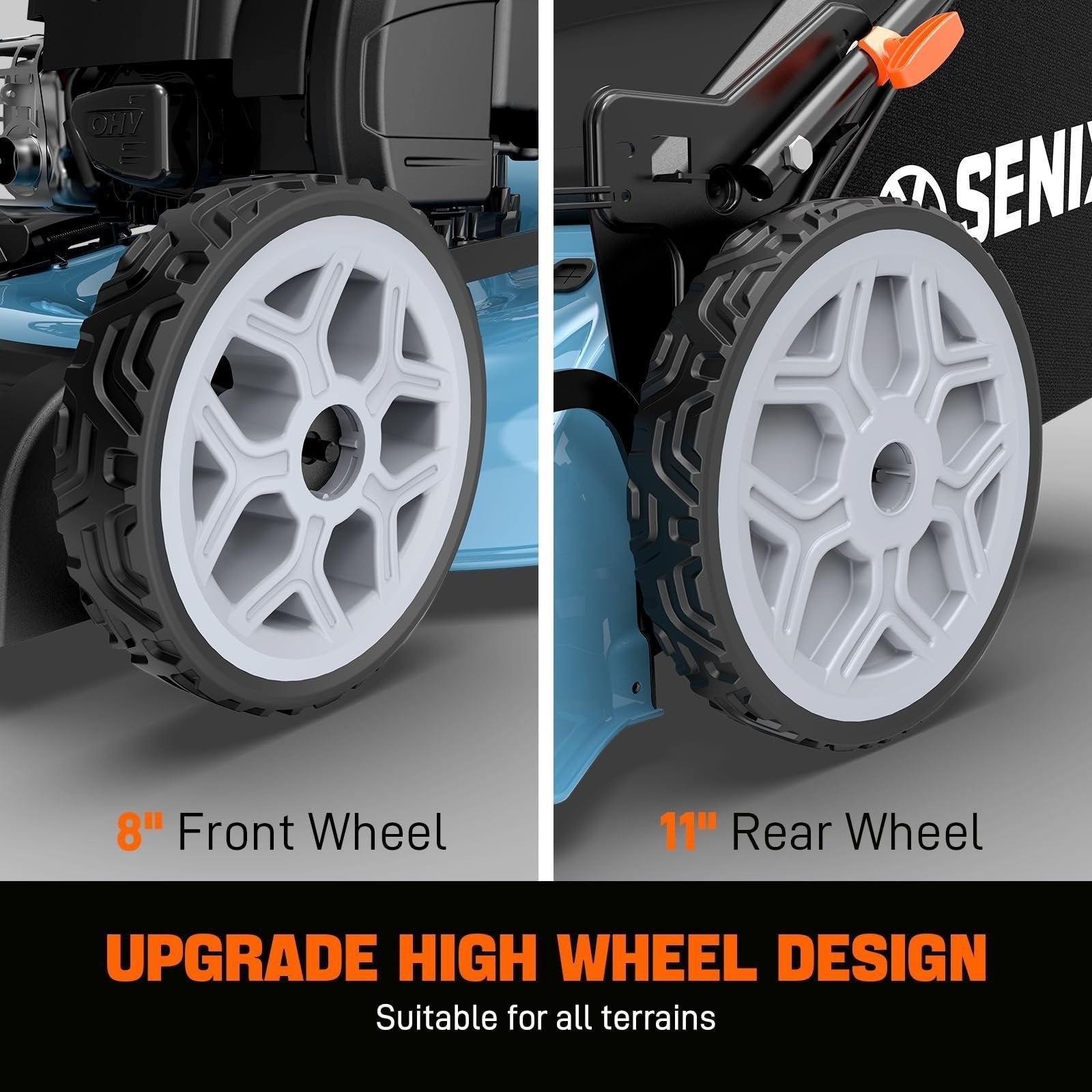 Details: Beautify your lawn with the SENIX 22-inch 163 cc self propelled lawn mower. This rear-wheel drive, variable speed self-propelled lawn mower features a 22-inch steel deck and is powered by a reliable Briggs & Stratton 163 cc gas powered engine that is designed to provide longer engine life, low vibration, and easy maintenance. The 4-stroke engine is eco-friendly offering low emissions, low fuel consumption, no mixing of oil and gas, and low noise. Auto choke start makes it easy to start the mower every time, and the 3-in-1 convertible deck allows you to mulch, side discharge, or rear bag grass clippings with our 19 gallon grass bag. This lawn mower is ideal for small to medium size yards. The durable 8-inch front and 11-inch rear wheels provide great maneuverability through rough terrain and uneven surfaces, can be adjusted to 6 different positions from 1.25-inches to 4-inches using a dual-lever to meet the needs and conditions of your lawn. Vertical storage saves up to 70% storage space with no fuel or oil leaks. All SENIX lawn mowers are backed by our 2-year limited warranty for your peace of mind.