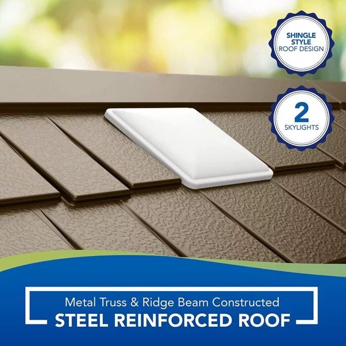 For convenience, the shed includes well-positioned skylights and windows that allow natural light to enter without compromising structural integrity. The double doors feature a padlock hasp, providing secure and easy access to your stored items.