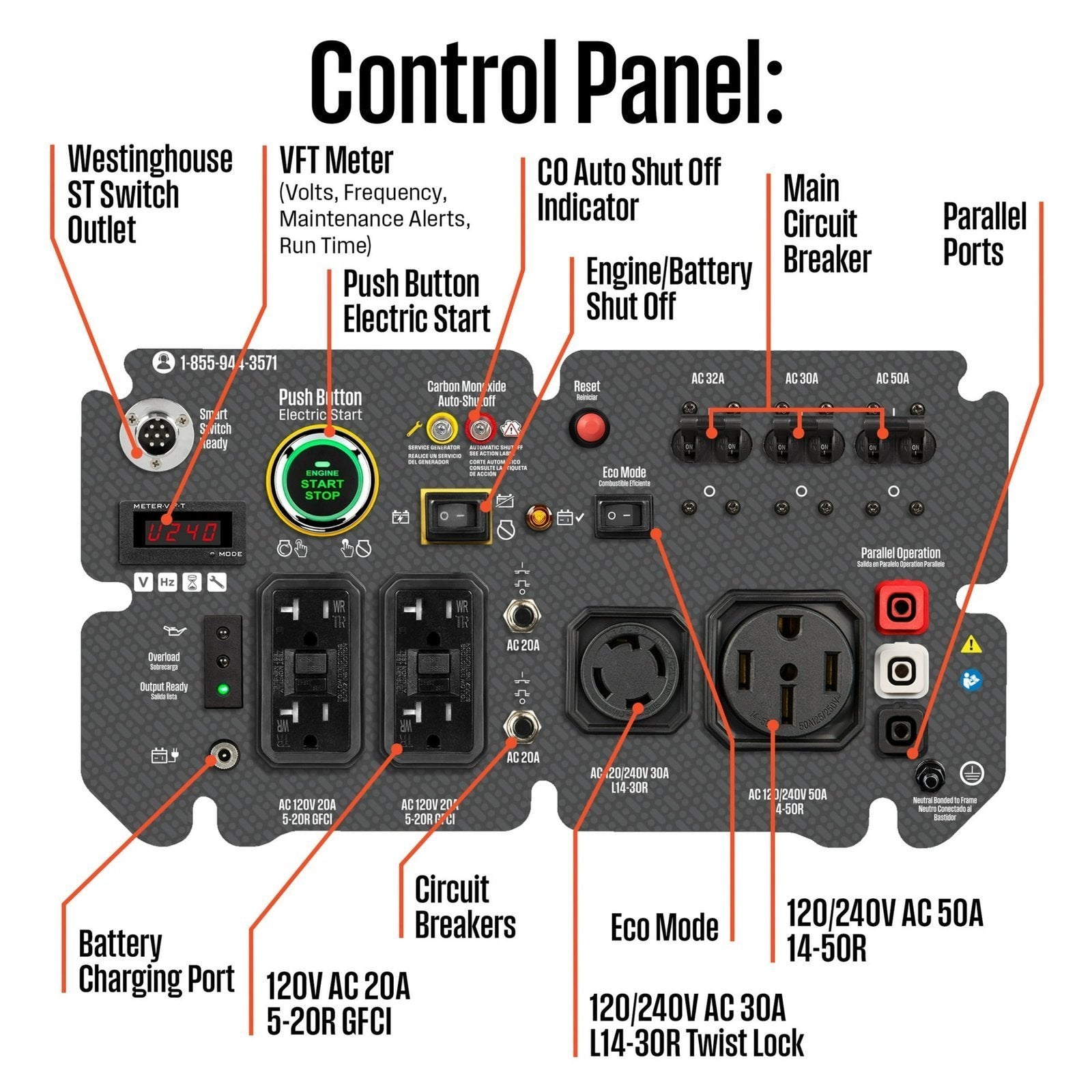 4x GFCI 5-20R 20A household outlets, 1x transfer switch ready L14-30R 120/240V twist-lock outlet, and 1x 120/240V 14-50R with rubber outlet covers