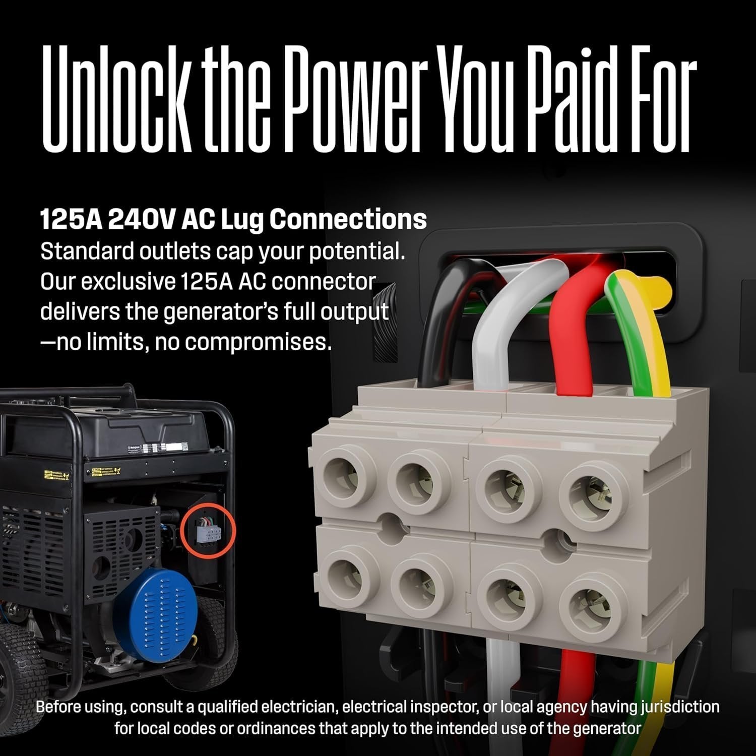 MAX POWER OPTION: With high output designed for easy whole-home backup, our exclusive 125A 240V AC terminal block lets a licensed electrician hardwire the generator directly to your home for full power delivery without the limits of cords or outlets