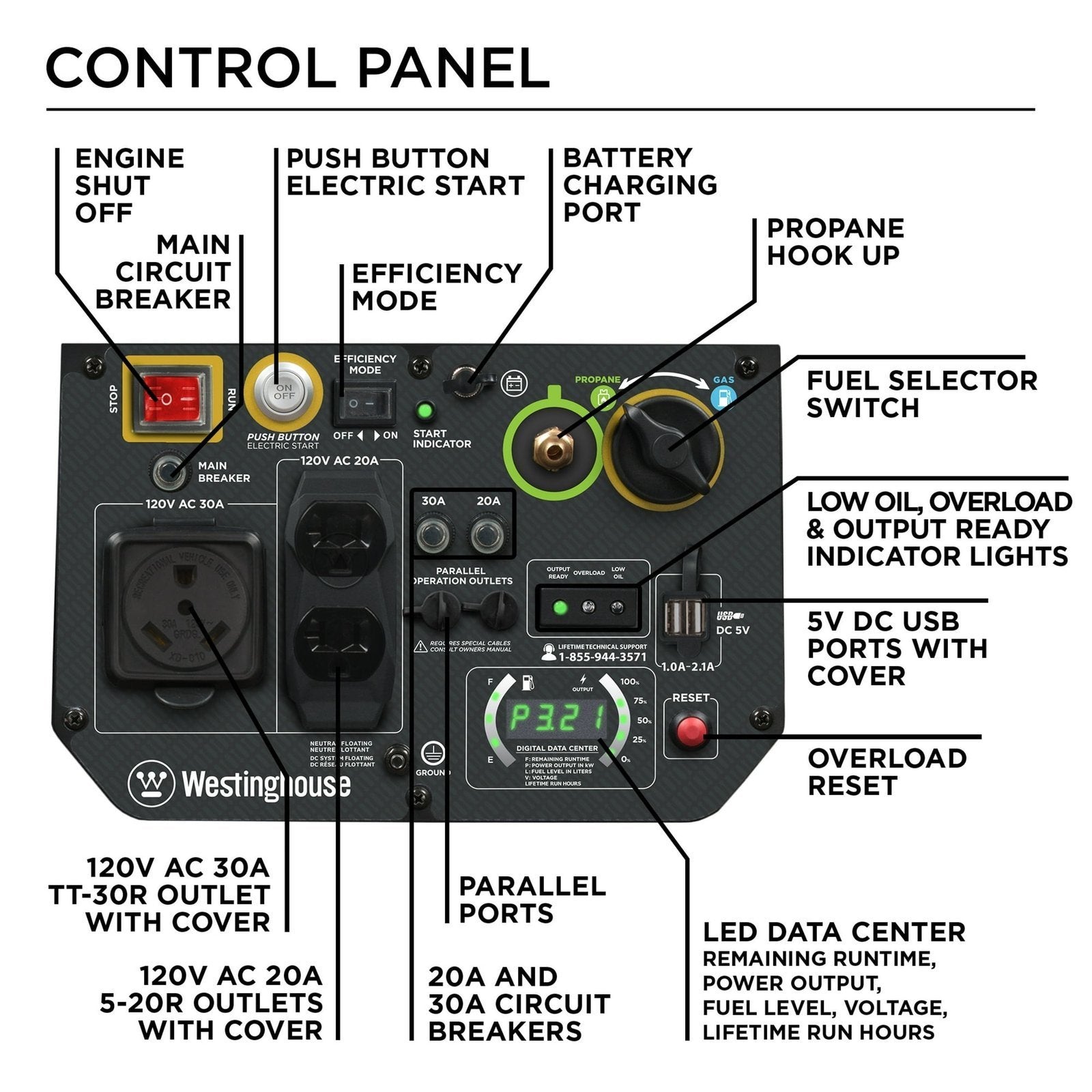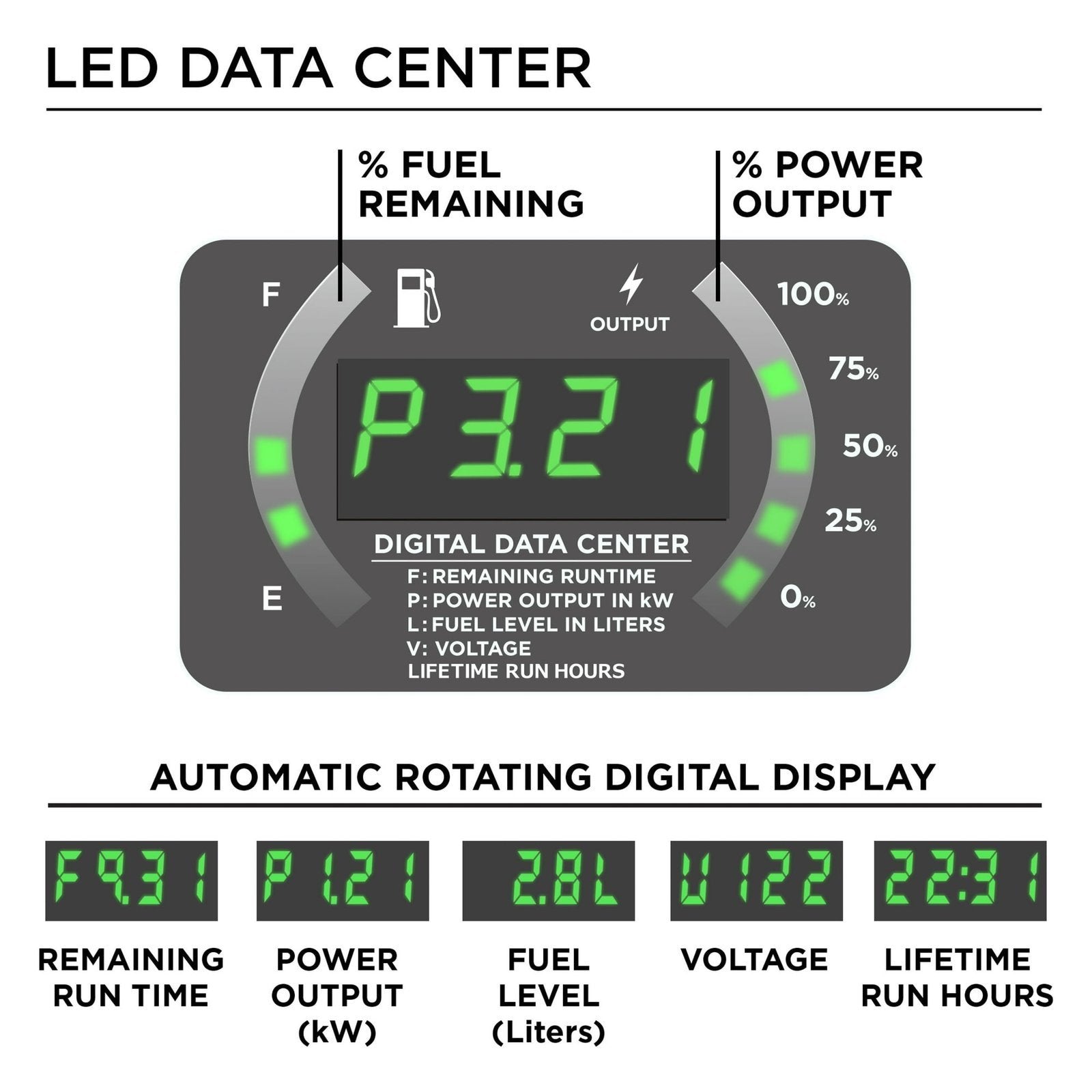 Real-time LED display with runtime, remaining fuel, load/output, volts and lifetime hours data