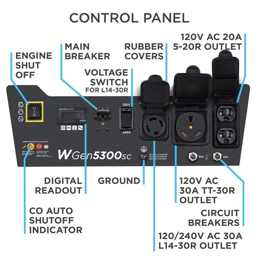 The Westinghouse WGen5300sc is a versatile solution for all your power needs from your home to your travel trailer when you’re looking for a dependable backup power supply. The WGen5300sc produces 6,600 peak watts and 5,300 running watts with a powerful 274cc 4-Stroke OHV Westinghouse Engine constructed for durability. Running for up to 14.5 hours on a 4.7 gal. (18L) tank of gas, it’s conveniently equipped with a built-in fuel gauge, automatic low oil shutdown, and electric start with manual choke. The L14-30R outlet is Transfer Switch Ready for total household power and eliminates the hassle for annoying extension cords or power strips. Combined with an RV Ready TT-30R outlet, all this generator needs is a one cord hookup to ensure your recreation vehicle or home is ready to go for air conditioners, refrigerators, sump pumps, and home necessities. The intuitive control panel includes the Digital Readout to share real-time updates on maintenance information, making it easy to care for the WGen5300sc with long life and lasting utility. Engineered into a compact hardened-steel frame with added roll bars, foam grip handle, and never-flat wheels, it lets you easily move this generator from storage to use. The WGen5300sc Portable Generator is complete with a 3-Year Limited Warranty and Lifetime Technical Support to ensure your confidence can be backed by our nationwide customer service and support network.